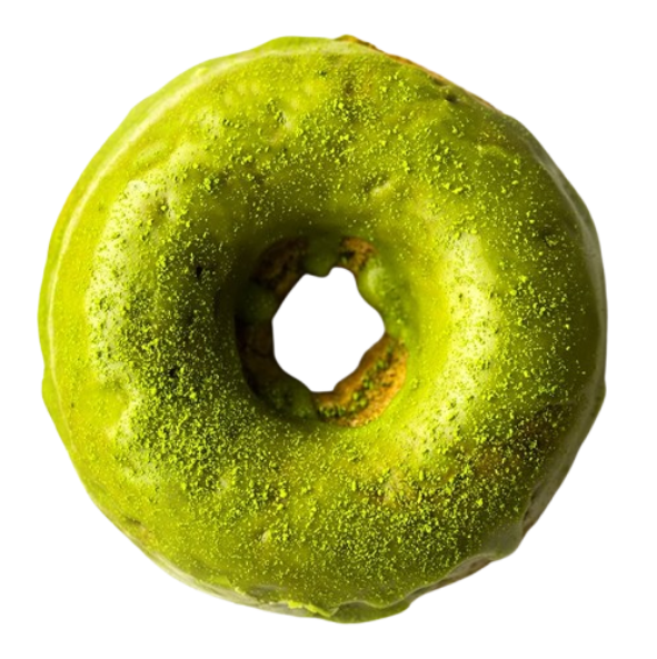 Donut dengan glasir matcha dan taburan crunchy di atasnya. pahit manis khas teh hijau yang alami, dan cocok sekali untuk para pecinta matcha
